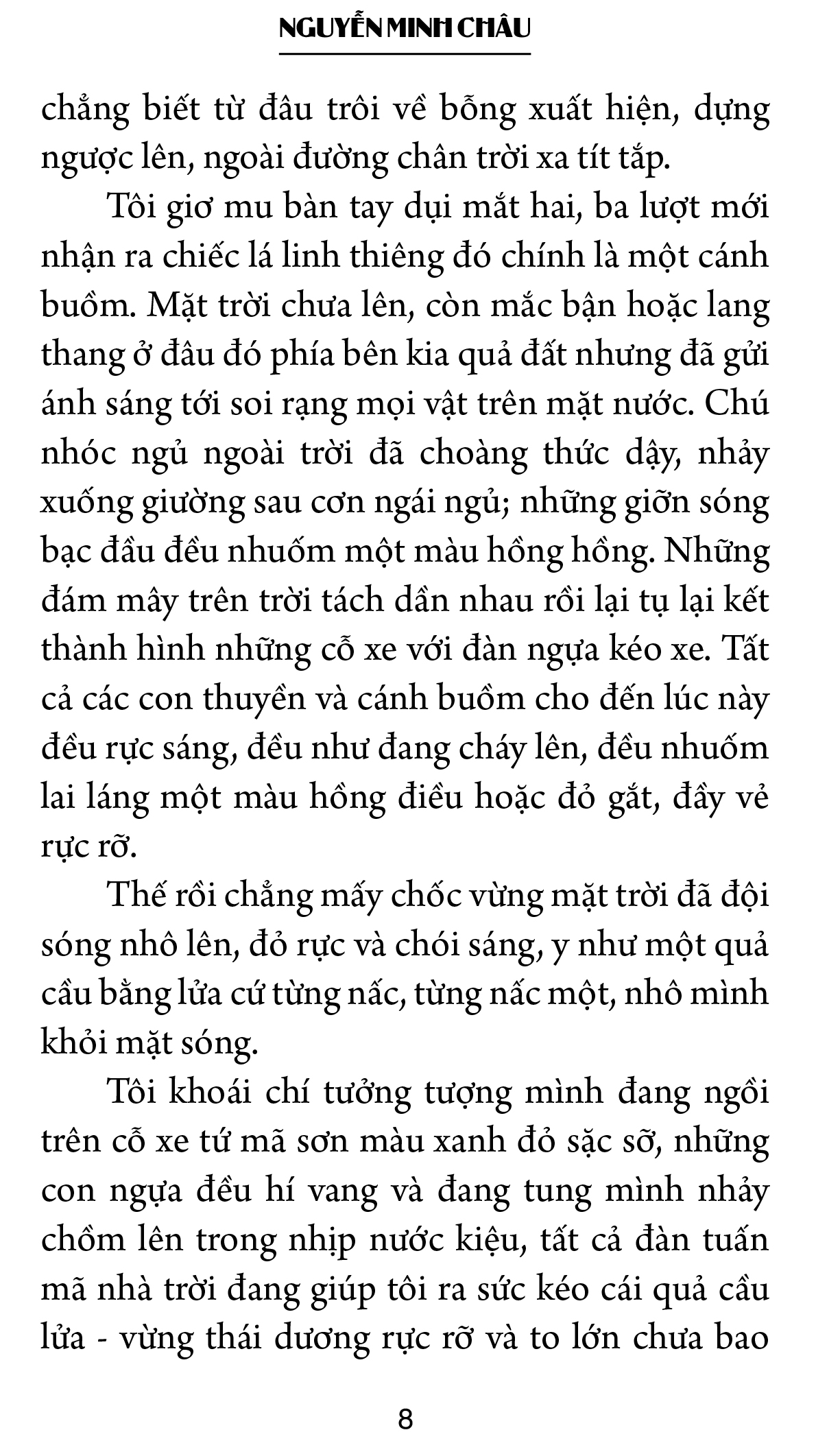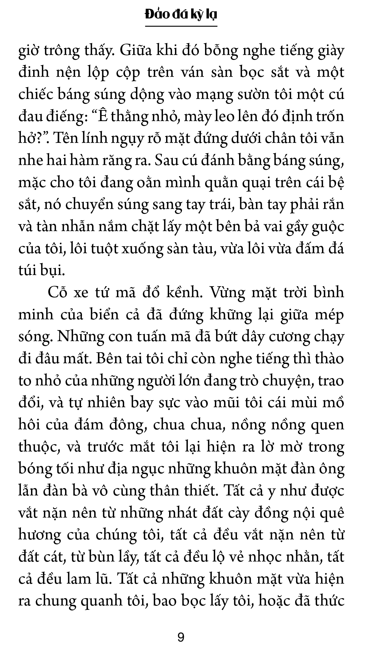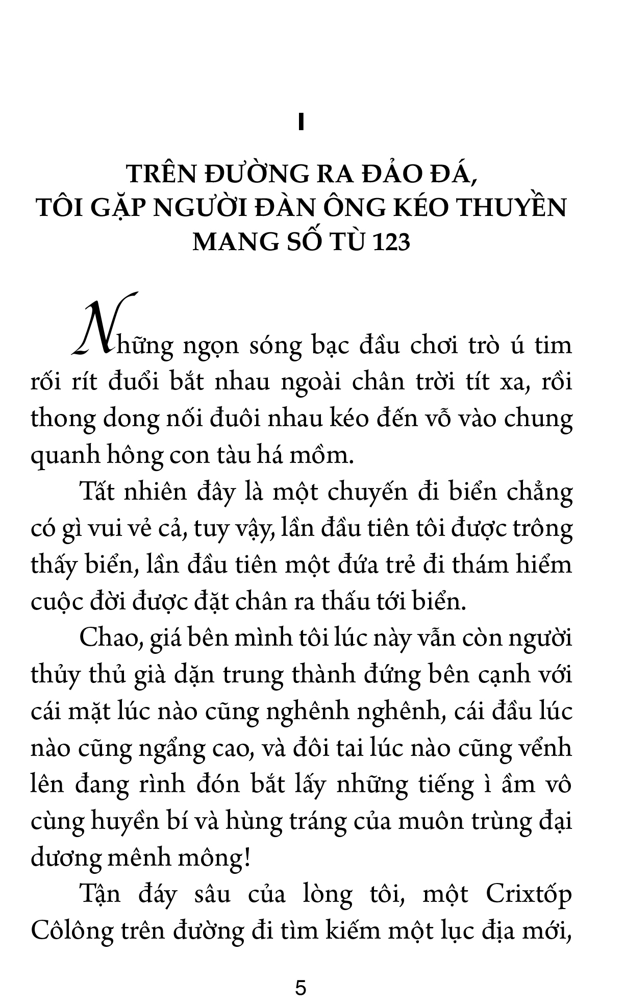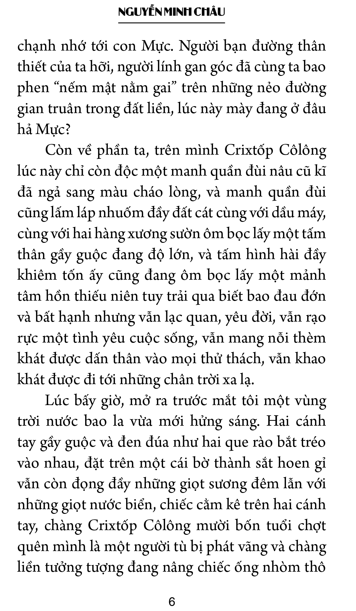 "Lúc bấy giờ, mở ra trước mắt tôi một vùng trời nước bao la vừa mới hửng sáng. Hai cánh tay gầy guộc và đen đúa như hai que rào bắt tréo vào nhau, đặt trên một cái bờ thành sắt hoen gỉ vẫn còn đọng đầy những giọt sương đêm lẫn với những giọt nước biển, chiếc cằm kê trên hai cánh tay, chàng Crixtốp Côlông mười bốn tuổi chợt quên mình là một người tù bị phát vãng và chàng liền tưởng tượng đang nâng chiếc ống nhòm thô sơ rất dài của những người đi biển thế kỷ XVII lên trước cặp mắt đang nheo nheo lại: trước mắt nhà thám hiểm vừa lìa bỏ đất liền, mặt biển như một chú nhóc không gia đình suốt đêm qua ngủ ngoài trời vừa chợt mở mắt, vẫn đang còn ngái ngủ."