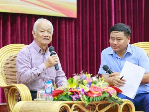 Tác giả Ngô Thịnh (trái) và dịch giả Nguyễn Thanh Diên (phải) trong buổi ra mắt sách.