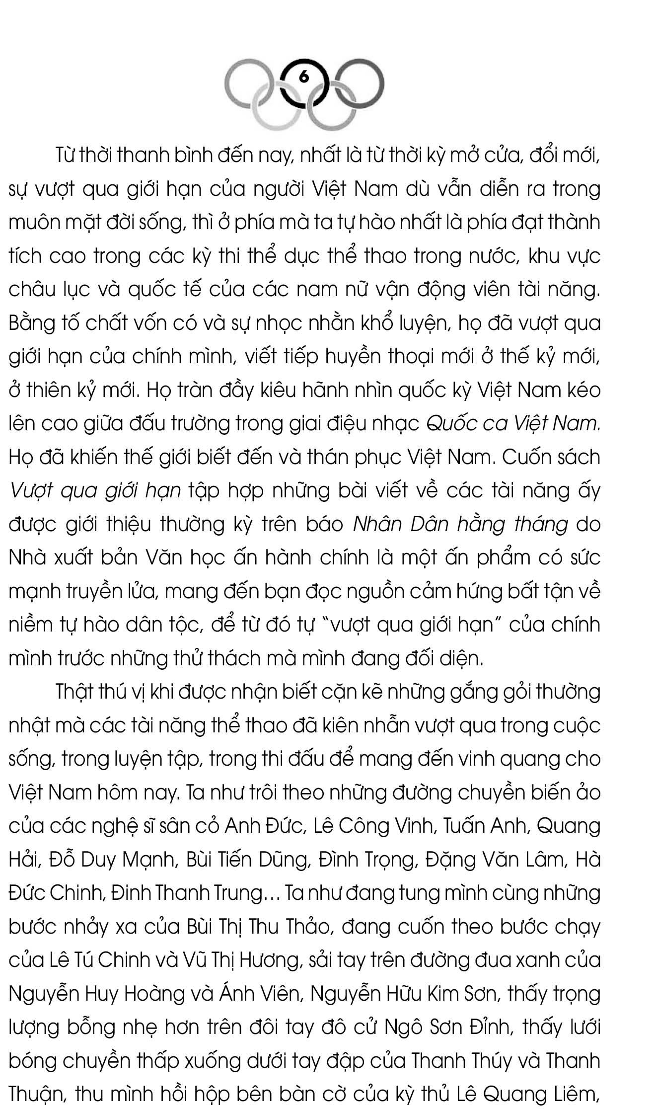 “Vượt qua giới hạn: Gương mặt thể thao trên Nhân Dân hàng tháng”, tuyển chọn 47 gương mặt thể thao, bao gồm các huấn luyện viên và các vận động viên tiêu biểu từ hàng trăm bài viết được đăng tải trong chuyên mục Thể thao của ấn phẩm Nhân Dân hằng tháng suốt 7 năm (từ 2012 đến 2019).